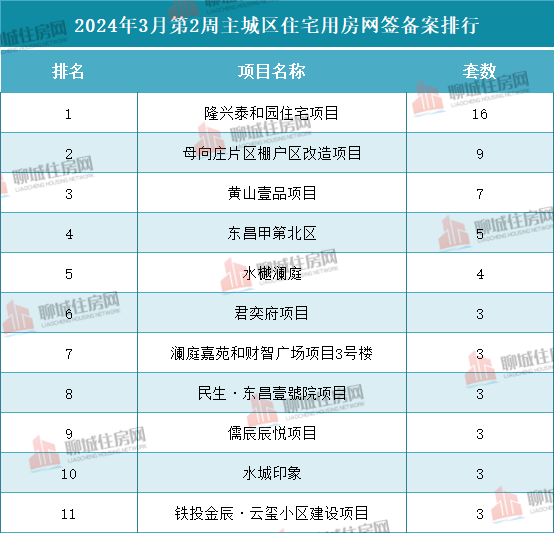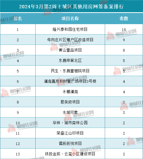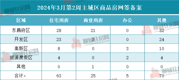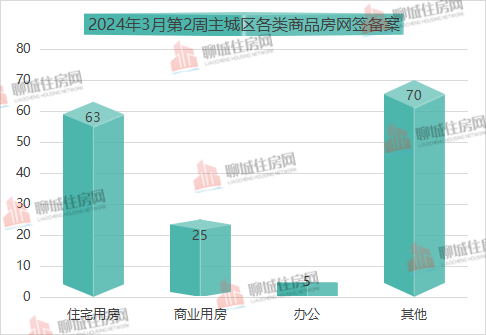 据住房网不完全统计,2024年3月第2周(2024.3.11-2024.3.17)聊城市主城区商品房网签备案数据共计163套!其中,住宅用房共63套,商业用房25套,办公5套,其他(车位、储藏室等其它房屋)为70套。