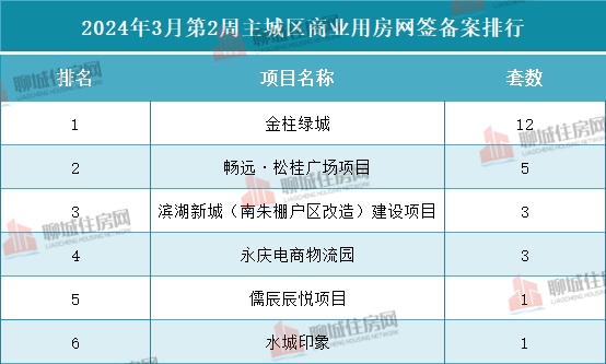 商业用房方面,网签备案项目共6个。数量最多的为金柱绿城,网签备案套数为12套;其次为畅远·松桂广场项目第二,网签备案套数均为5套。滨湖新城(南朱棚户区改造)建设项目和永庆电商物流园并列第三,网签备案数量为均为3套。