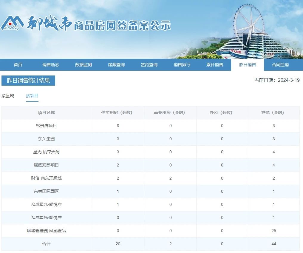 2024年3月18日,聊城市主城区商品房网签统计共66套。其中住宅用房20套,商业用房2套,其他住房44套。