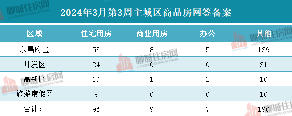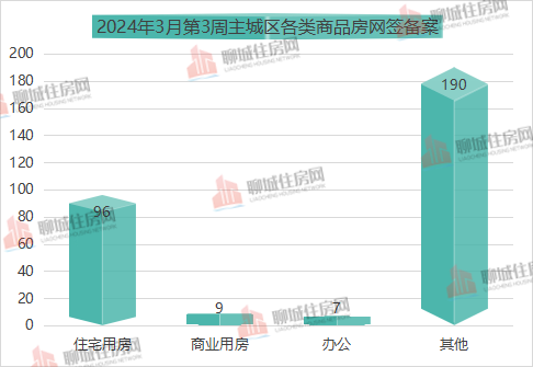 据住房网不完全统计,2024年3月第3周(2024.3.18-2024.3.24)聊城市主城区商品房网签备案数据共计302套!其中,住宅用房共96套,商业用房9套,办公7套,其他(车位、储藏室等其它房屋)为190套。