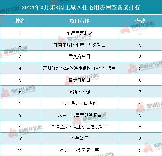 住宅用房方面,网签备案项目共26个。数量最多的为东昌甲第北区,共13套;其次为母向庄片区棚户区改造项目,网签备案套数为9套;君亦府项目、聊城江北水城旅游度假区118地块项目和松贵府项目并列第三,网签备案套数各为8套。