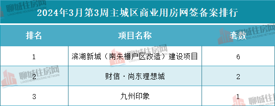 商业用房方面,网签备案项目共3个。数量最多的为滨湖新城(南朱棚户区改造)建设项目,网签备案套数为6套;其次为财信·尚东理想城第二,网签备案套数均为2套。九州印象位列第三,网签备案数量为1套。