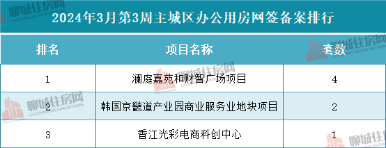 办公用房方面,共有3个项目进行网签备案,数量最多的为澜庭嘉苑和财智广场项目,网签备案套数为4套;其次为韩国京畿道产业园商业服务业地块项目位列第二,网签备案套数为2套;香江光彩电商科创中心位列第三,网签备案数量为1套。