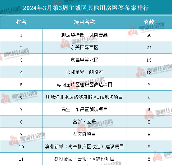 其他用房方面,共有26个项目进行网签备案。数量最多的为聊城碧桂园·凤凰壹品,共60套;其次为东关国际西区,网签备案套数为24套;东昌甲第北区位列第三,网签备案套数为13套。