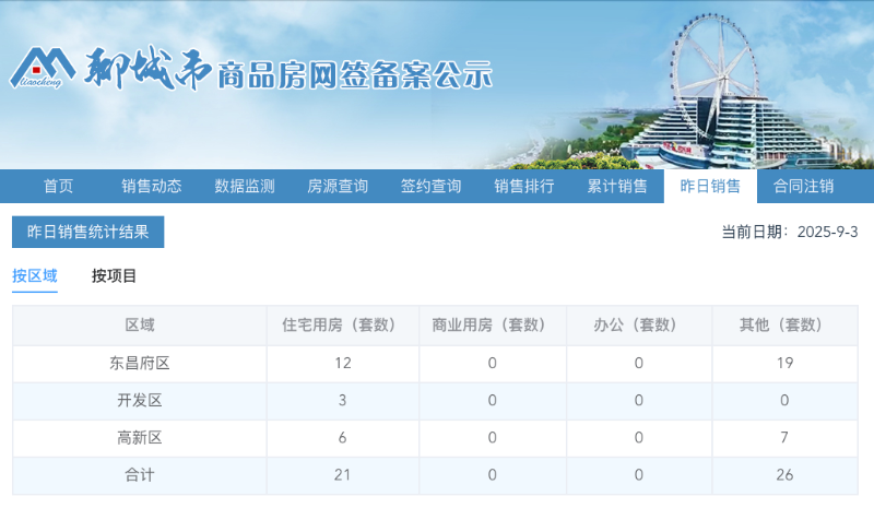 从网签区域来看,住宅网签量最多的地区为东昌府区,共为31套。其中住宅用房12套,其他19套。