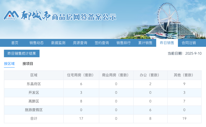 2025年9月9日,聊城市主城区商品房网签统计共44套。其中住宅用房17套,办公8套,其他19套。