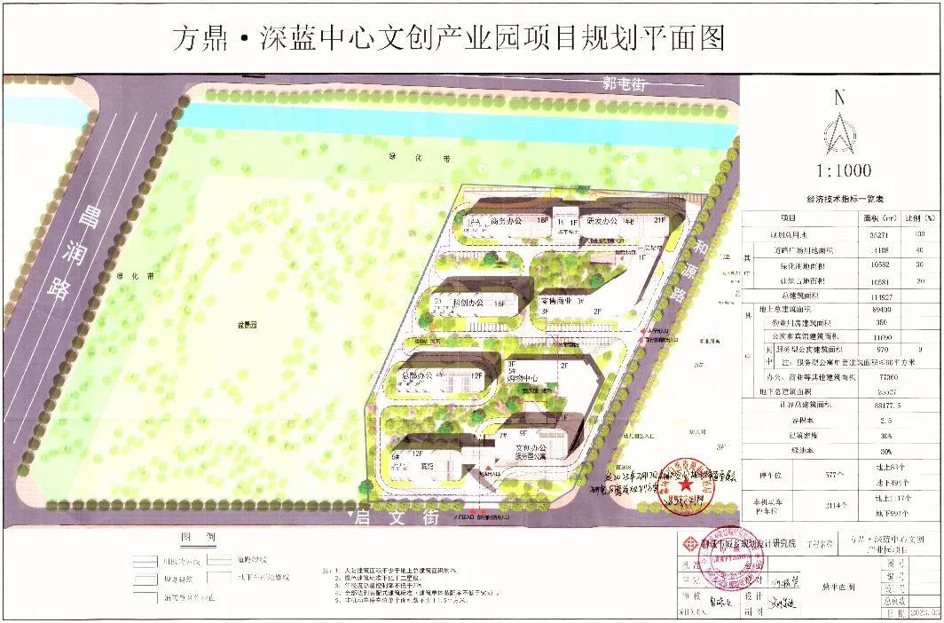 方鼎深蓝中心文创产业园项目总占地面积为35271㎡,总建筑面积为89400㎡。 从平面图看,项目规划设计容积率约2.5,项目规划8栋楼。其中: 1#-A楼18层,为商务办公; 1#-B楼21层,为研发办公; 2#楼16层,为科创办公; 3#楼3层,为零售商业; 4#楼12层,为总部办公; 5#楼3层,为购物中心; 6#楼12层,为宾馆; 7#楼9层,为文创办公服务型公寓。 建筑密度30%,绿地率30%,停车位(地上83个、地下494个)577个,非机动车停车位(地上1117个、地下997个)2114个。