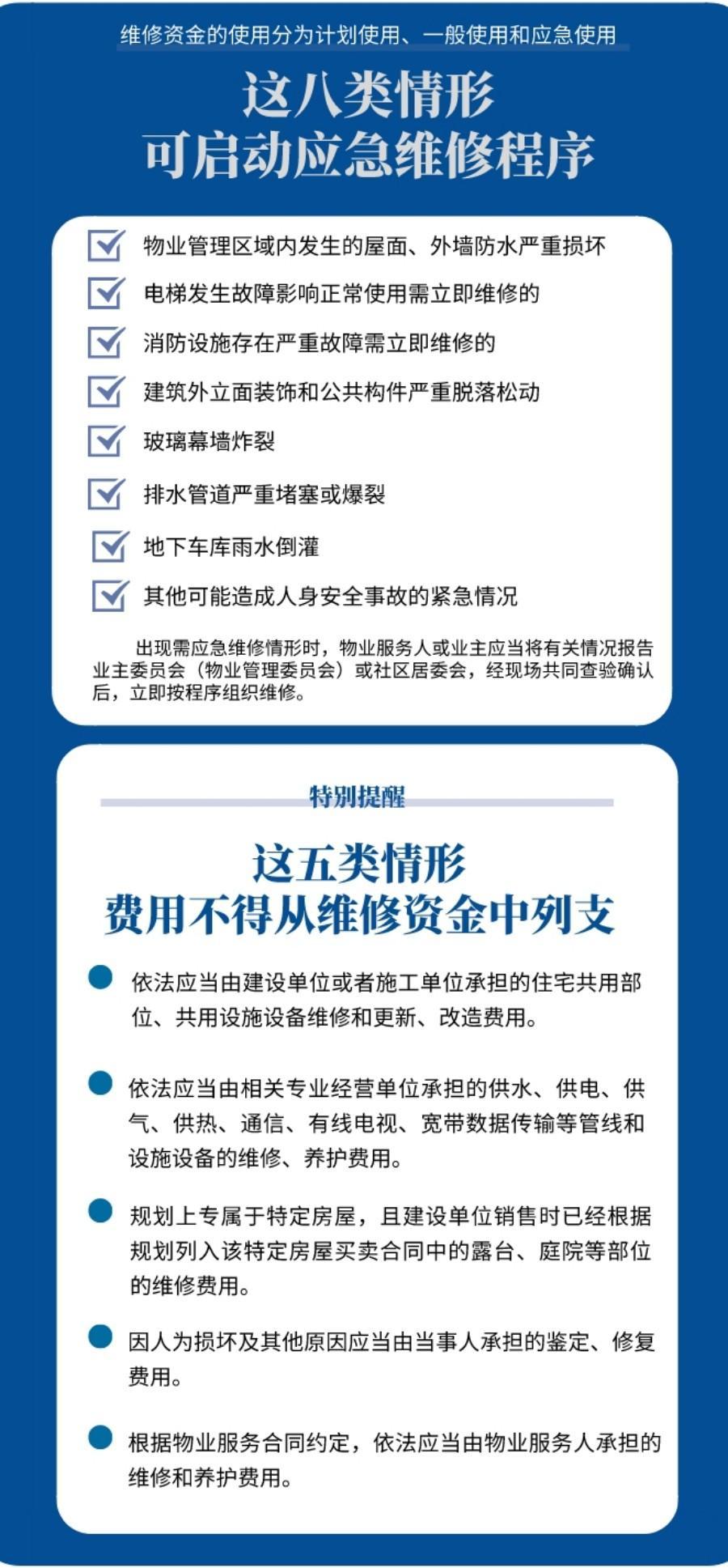 办法明确,维修资金的使用分为计划使用、一般使用和应急使用。