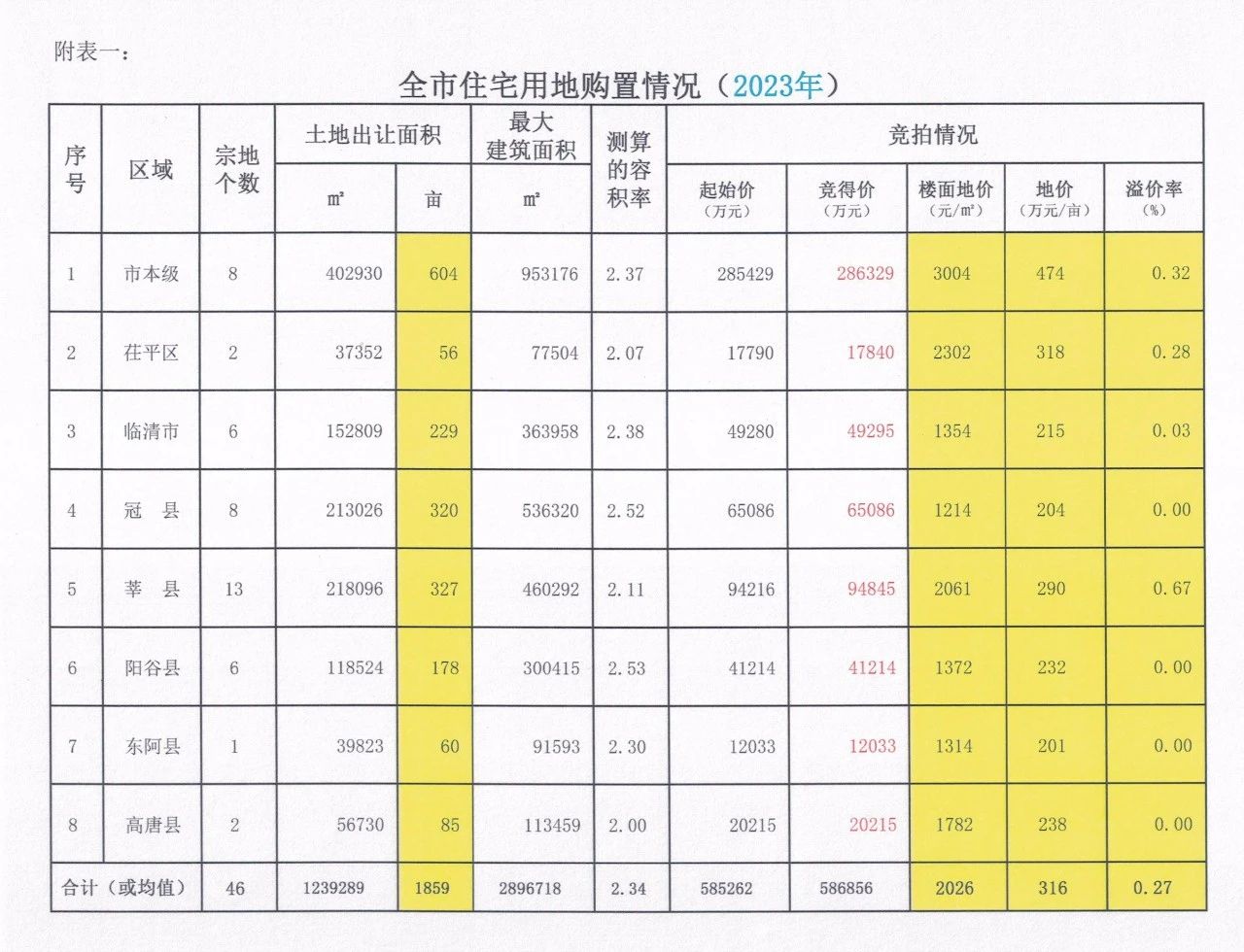 附表一:全市住宅用地购置情况(2023年)