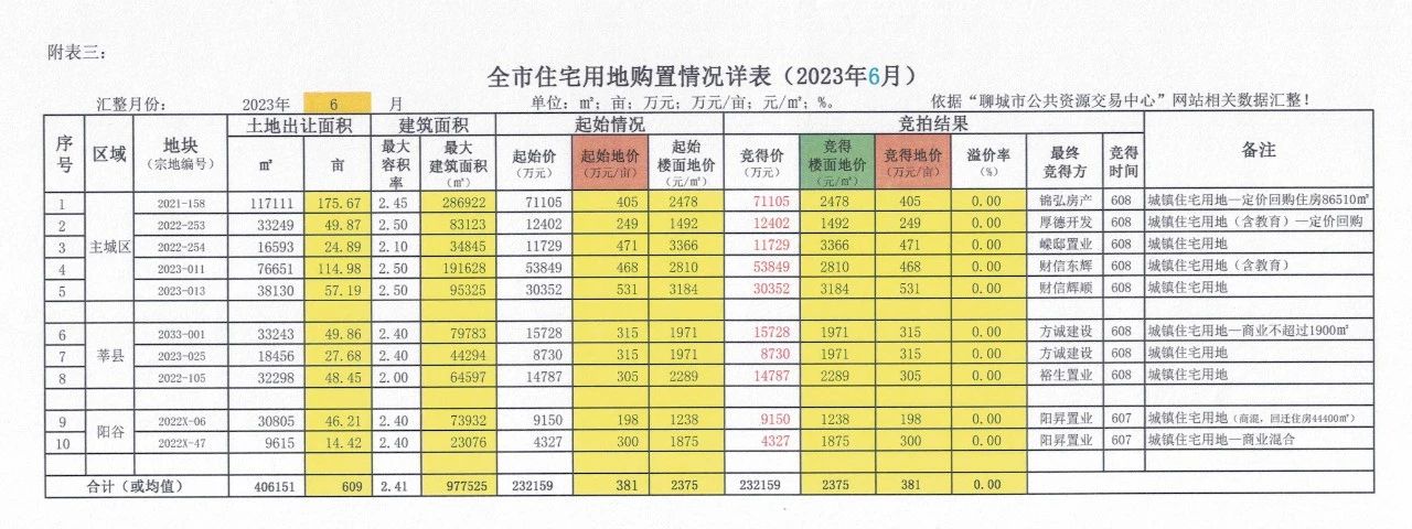 附表三:2023年住宅用地购置情况详表(2023年6月)