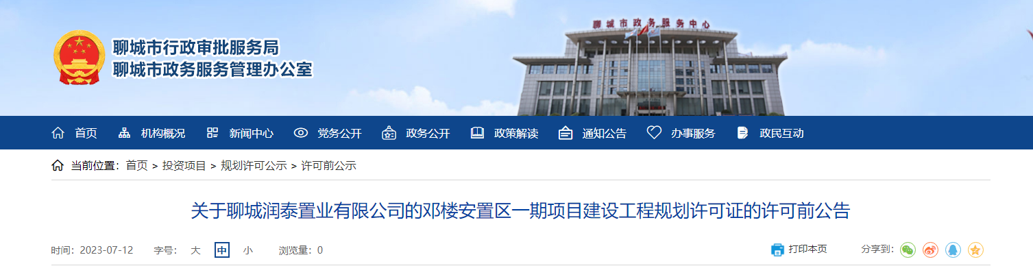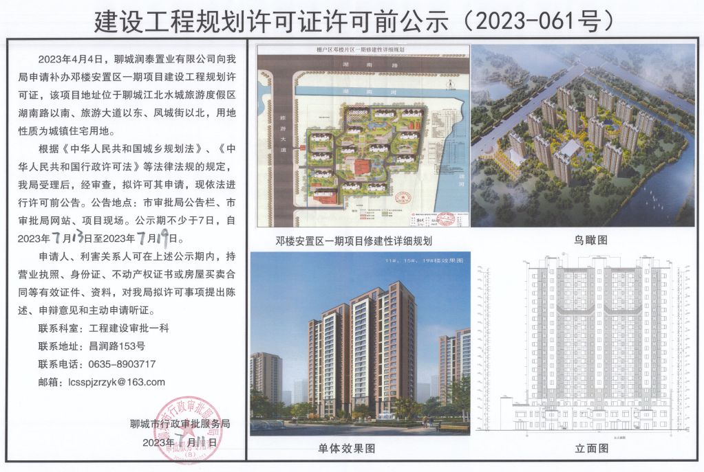 2023年4月4日,聊城润泰置业有限公司向我局申请补办邓楼安置区一期项目建设工程规划许可证,该项目地址位于聊城江北水镇旅游度假湖南路以南、旅游大道以东、凤城街以北,用地性质为城镇住宅用地。