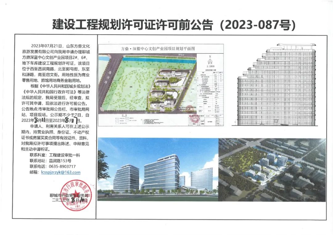 2023年07月21日,山东方鼎文化旅游发展有限公司向我局申请办理聊城方鼎深蓝中心文创产业园项目2#、6#地下车库建设工程规划许可证,该项目位于西至昌润南路,北至郭屯街,东至和源路,南至启文街。用地性质为商业零售用地、旅馆用地商务金融用地。