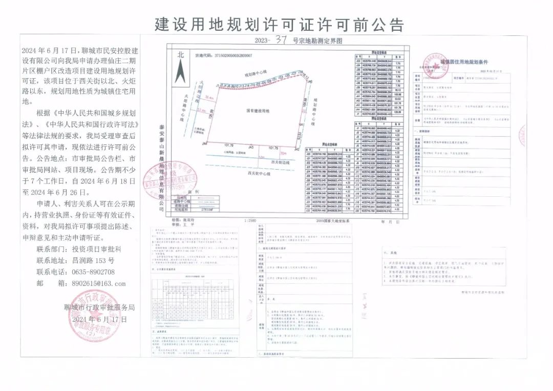 2024 年6月17 日聊城市民安控股建设有限公司向我局申请办理仙庄二期片区棚户区改造项目建设用地规划许可证,该项目位于西关街以北、火炬路以东,规划用地性质为城镇住宅用地。 根据《中华人民共和国城乡规划法》、《中华人民共和国行政许可法)等法律法规的要求,我局受理审查后拟许可其申请,现依法进行许可前公告。公告地点:市审批局公告栏、市审批局网站、项目现场。公告期不少于7个工作日,自2024年6月18 日至2024年6月26日。 申请人、利害关系人可在公示期内,持营业执照、身份证等有效证件资料,对我局拟许可事项提出陈述.申辩意见和主动申请听证。 联系部门:投资项目审批科 联系地址:昌润路153号 联系电话:0635-8902708 邮箱:8902615@163.com 聊城市行政审批服务局 2024年6月17日