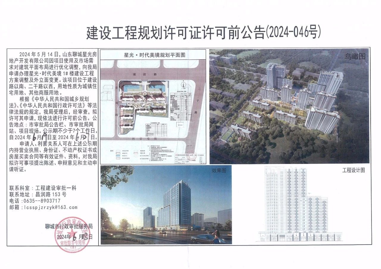 2024年5早14 日山东聊城星光房地产开发有限公闯因项目使用及市场需求对建筑平面布局进行优化调整,向我局申请办理星光·时代美境 1# 楼建设工程方案调整及外立面变更。该项目位于建设路以南、二干路以西,用地性质为城镇住宅用地、其他商服用地。 根据《中华人民共和国城乡规划法》《中华人民共和国行政许可法》等法律法规的规定,我局受理后,经审查,拟许可其申请,现依法进行许可前公告。公告地点: 市审批局公告栏、市审批局网站、项目现场。公示期不少于7个工作日,自2024年6月19日至2024年6月27日。 申请人、利害关系人可在上述公示期内,持营业执照、身份证、不动产权证书或房屋买卖合同等有效证件、资料,对我局拟许可事项提出陈述、申辩意见和主动申请听证。 联系科室:工程建设审批一科 联系地址:昌润路153号 联系电话:0635-8903717 邮箱:lcsspjzrzyk@163.com 聊城市行政审批服务局 2024年6月18日