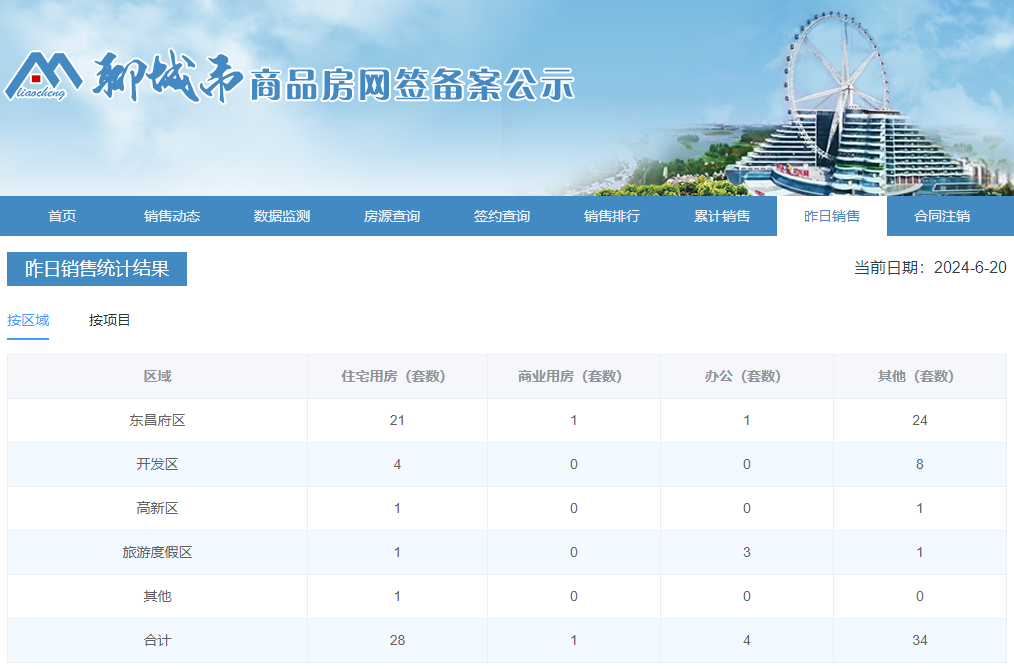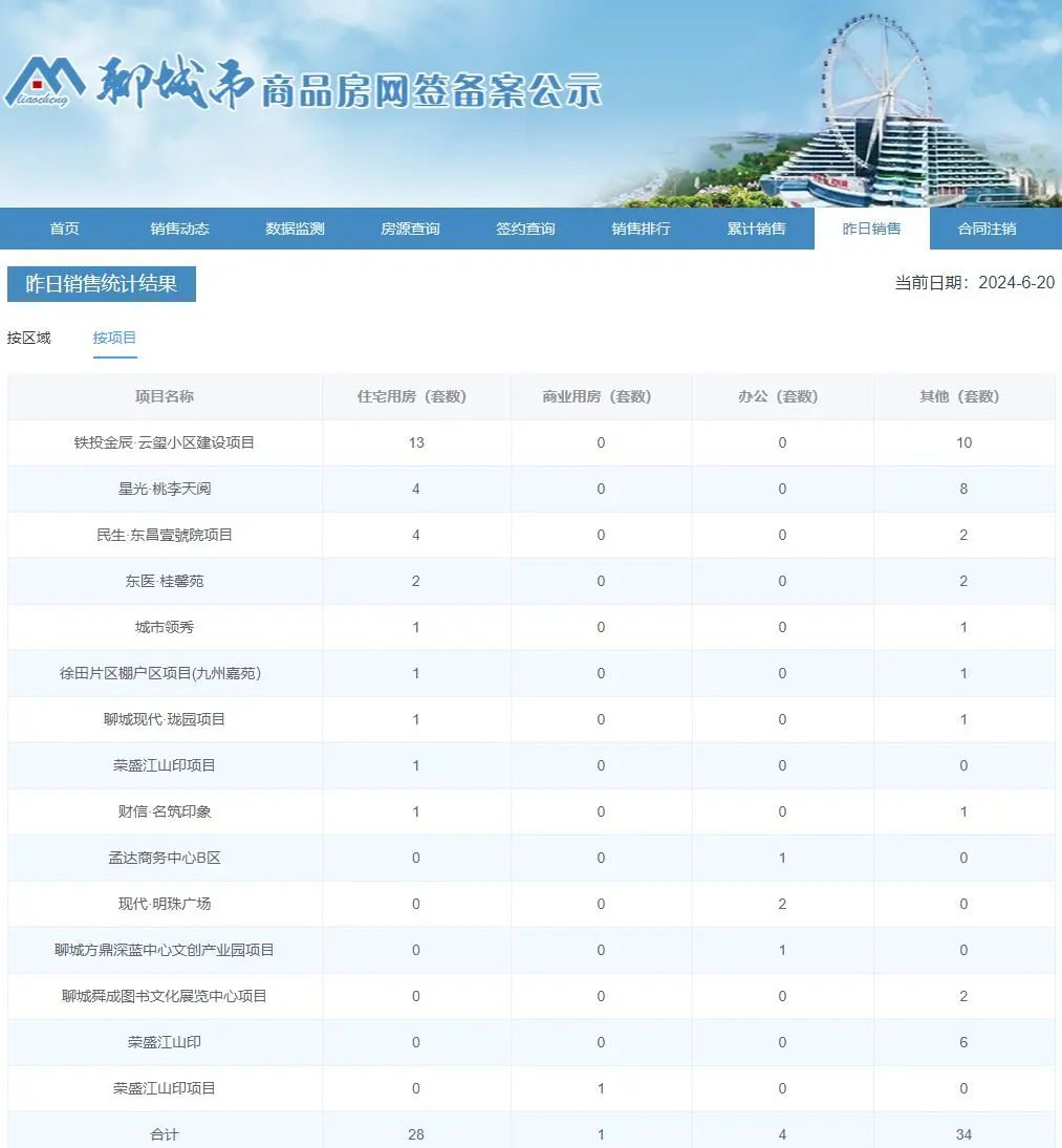 2024年6月19日,聊城市主城区商品房网签统计共67套。其中住宅用房26套,商业用房1套,办公4套,其他住房34套。