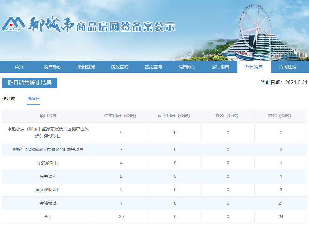 2024年6月20日,聊城市主城区商品房网签统计共59套。其中住宅用房25套,其他住房34套。
